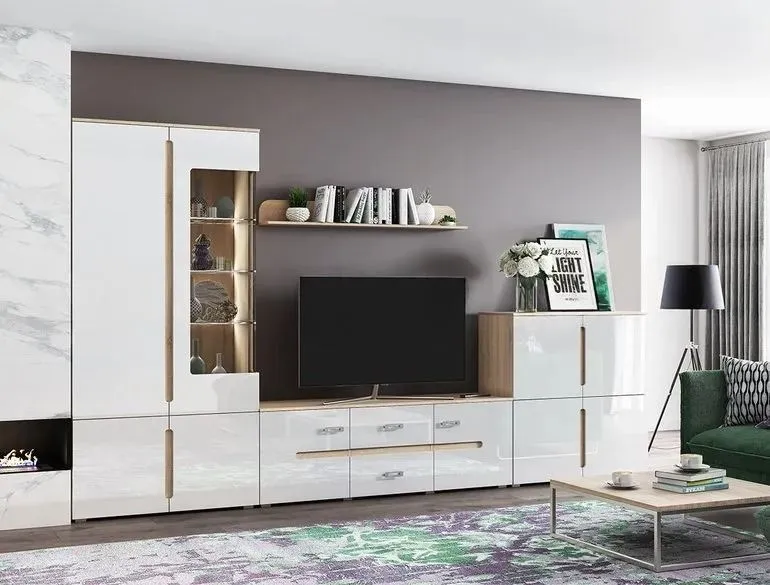 Гостиная Ким - готовый стильный комплект мебели для современной гостиной, состоящий из пяти предметов общей шириной 360 см, изготовлен с фасадами из МДФ . Комбинированный шкаф-витрина укомплектован подсветкой. Выдвижные ящики оснащены роликовыми направляющими. Напольные модули имеют в основании квадратные низкие опоры.
