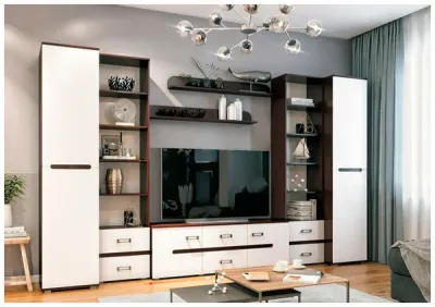 Гостиная Ким - готовый стильный комплект мебели для современной гостиной, состоящий из пяти предметов общей шириной 360 см, изготовлен с фасадами из МДФ . Комбинированный шкаф-витрина укомплектован подсветкой. Выдвижные ящики оснащены роликовыми направляющими. Напольные модули имеют в основании квадратные низкие опоры.