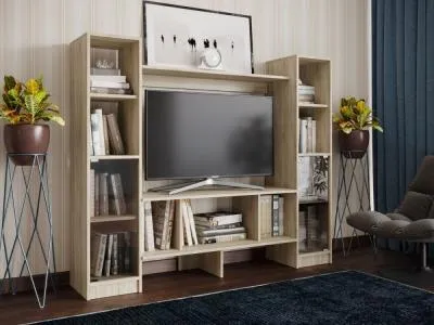 Эта маленькая стенка, скорее, напоминает стеллаж, но в небольшом помещении станет хорошей альтернативой многофункциональному мебельному гарнитуру. Смотрится компактно, аккуратно и в то же время стильно.