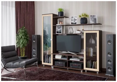 Каскадная, оригинальная по дизайну, современная гостиная в стиле минимализма. Особый шик ей придают боковые вертикальные модули с тонированным стеклом. Для ценителей уюта и красоты.