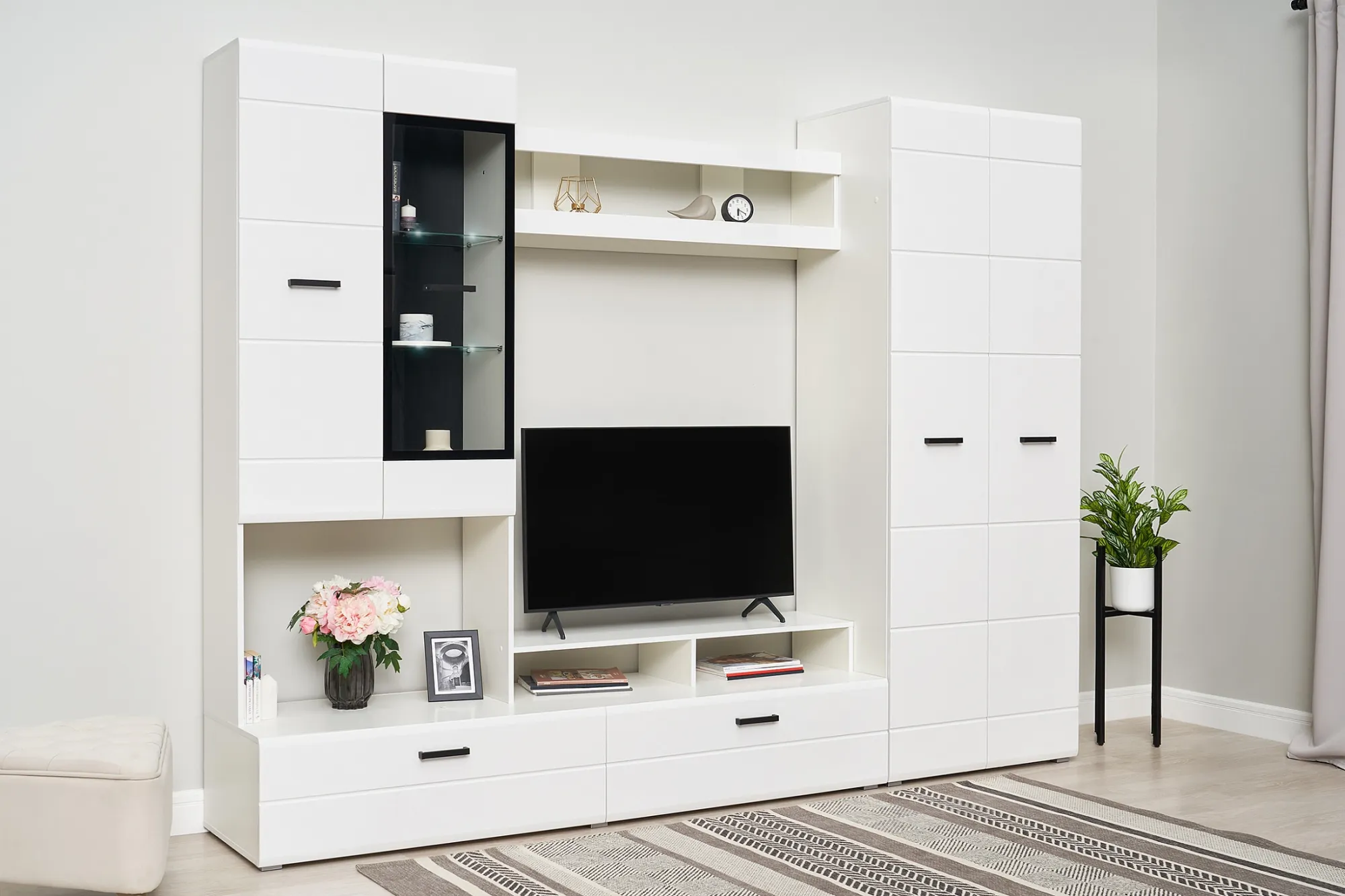 Гостиная Нэнси NEW — изысканная, белоснежная с приятным блеском гостиная, несомненно украсит собой любую квартиру или дом. В гостиной есть все необходимые элементы для красивого оформления комнаты. Фасады с фрезеровкой и стеклянные витрины создают современный и стильный образ вашему дому.