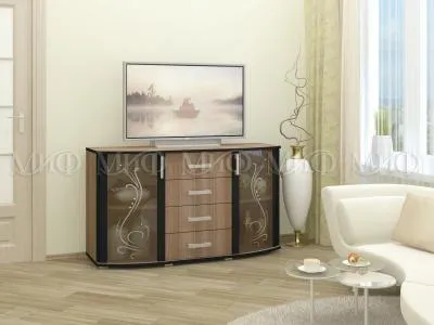 Напольная подставка под телевизор и прочую технику. Продуманная кон- струкция включает в себя боковые шкафчики и четыре выдвижных ящика. Объем тумбы увеличен за счет выпуклой передней части.
