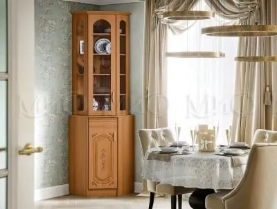 Угловой буфет Лиза 2 отлично дополняет пространство гостиной или кухни, создавая дополнительное место для хранения посуды. За стеклянными дверцами находятся широкие полки, за распашной дверцей можно хранить от посторонних взглядов остальные предметы.