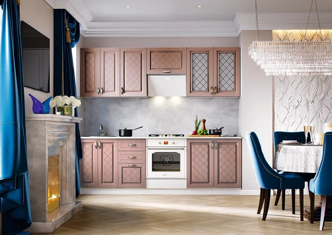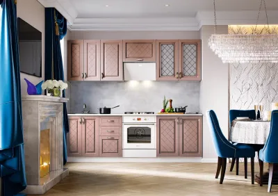 Кухня Ирина — стильный гарнитур, изготовленный на каркасе ЛДСП белого цвета, рамочные фасады МДФ с глубокой фрезеровкой в декоре трюфель, стекла матовые с рисунком, ручка сталь.