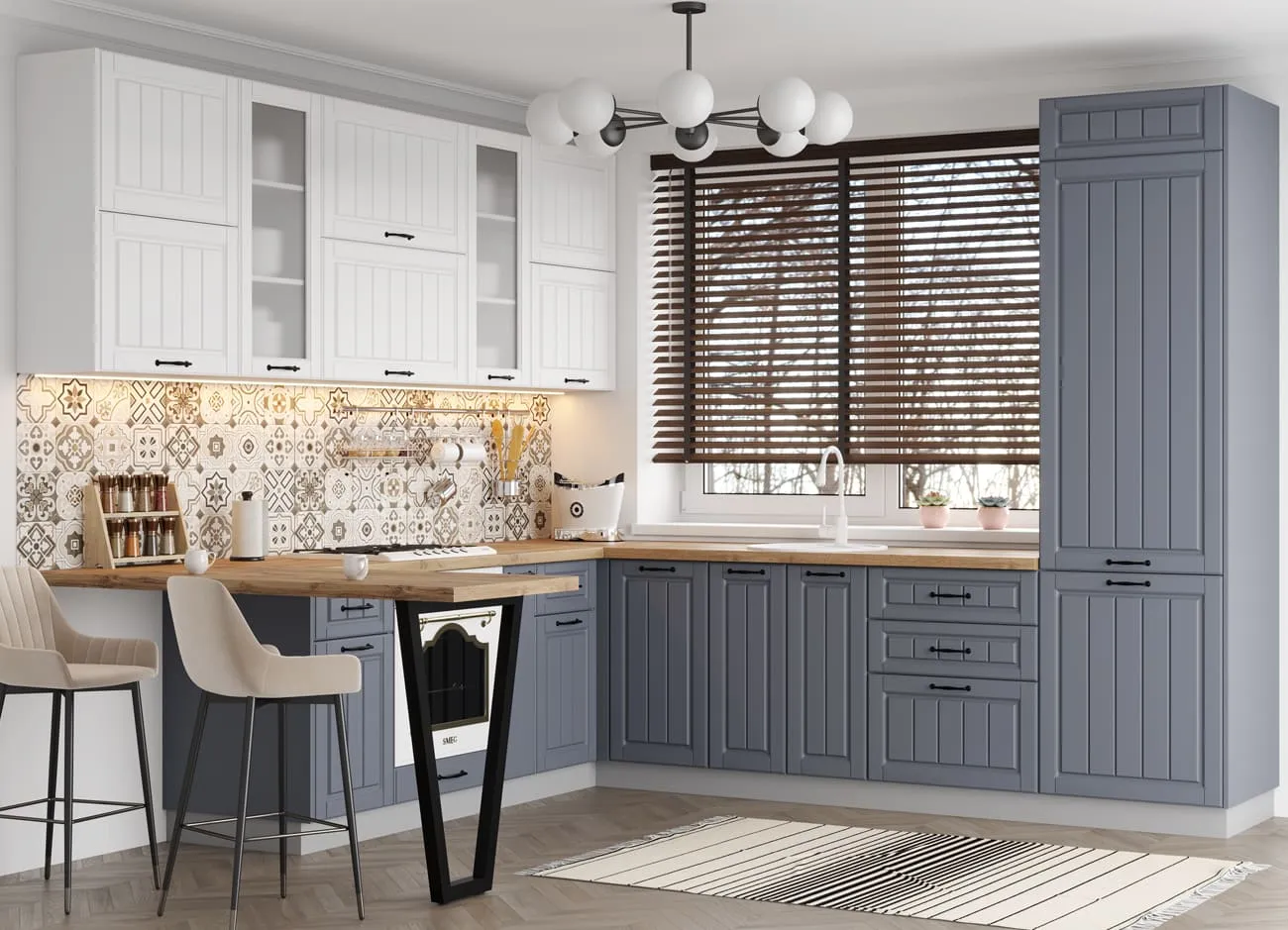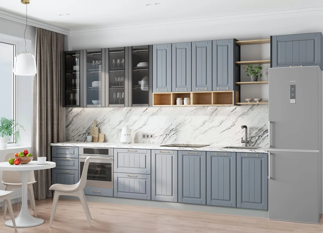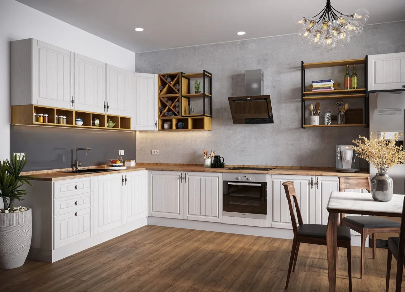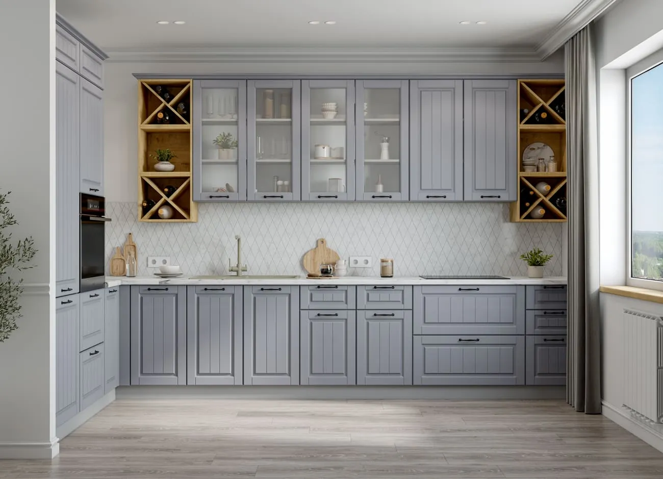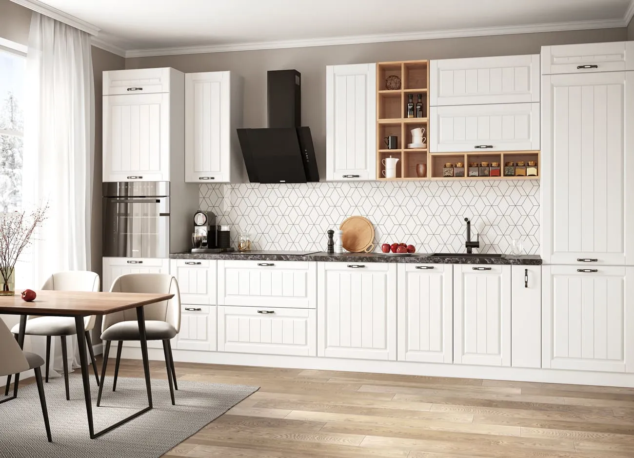 Благодаря индивидуальной комплектации, можно собрать недорогой и стильный кухонный комплект, который идеально впишется в современные интерьеры кухонного пространства. Использование модулей со светлыми оттенками фасадов и серым корпусом поможет создать в небольшом помещении визуальное ощущение простора и большого пространства.