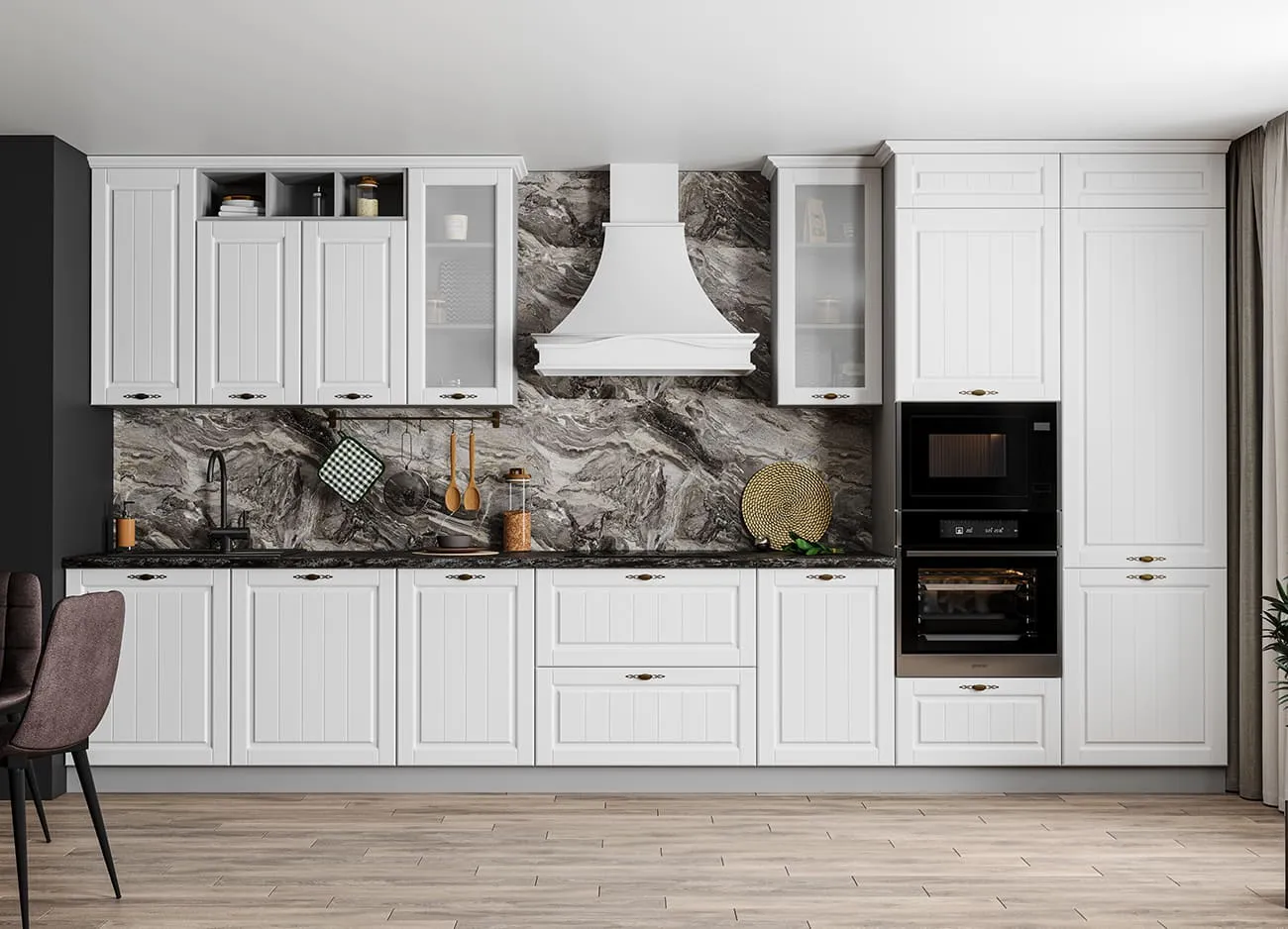 Темные фасады в сочетании с серыми деталями корпуса внесут в обстановку кухни благородство и элегантность. Отделанные стеклянными вставками верхние навесные шкафы сделают верхнюю линию кухонного комплекта более легкой и воздушной.