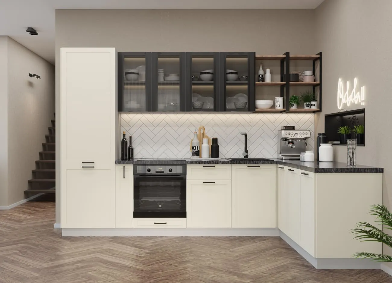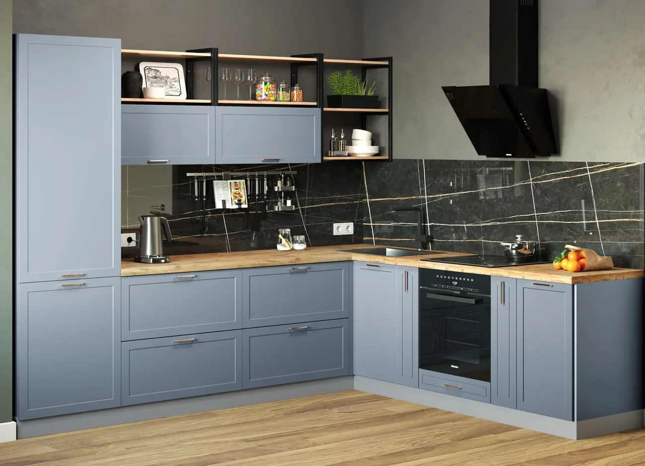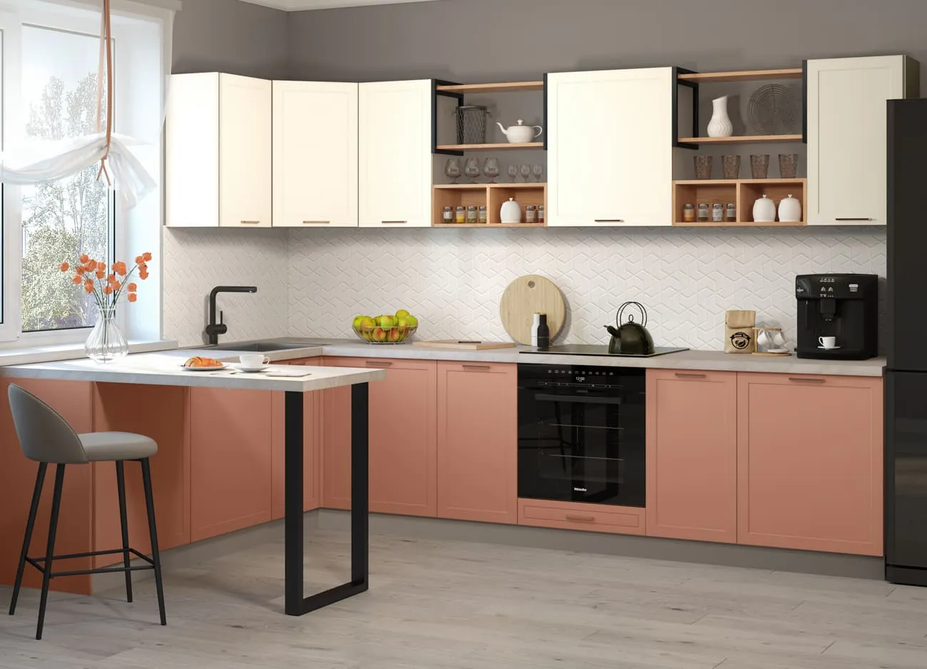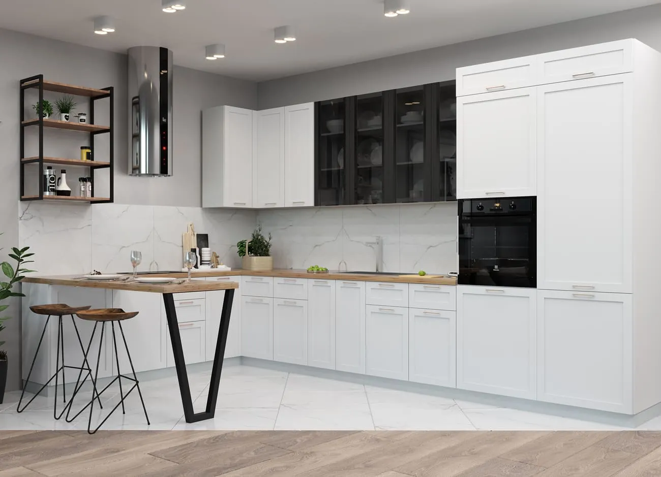 Кухонный гарнитур «Квадро» — удачное воплощение скандинавского стиля, прекрасно адаптированное к вкусам современных хозяек. Открытые полки и подвесные шкафчики с остеклением вносят в облик кухонного гарнитура нотки легкости и воздушности.