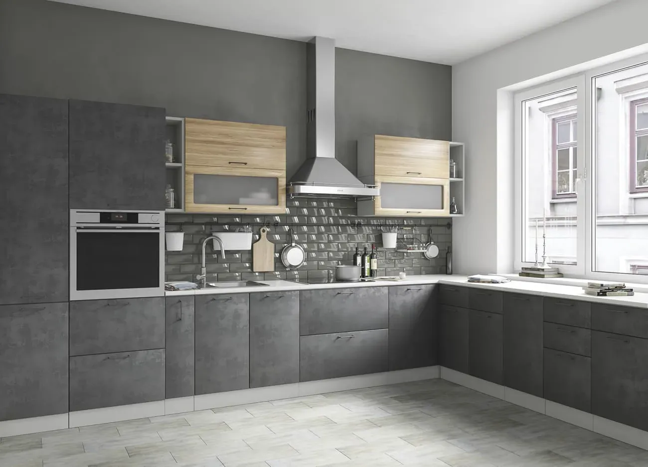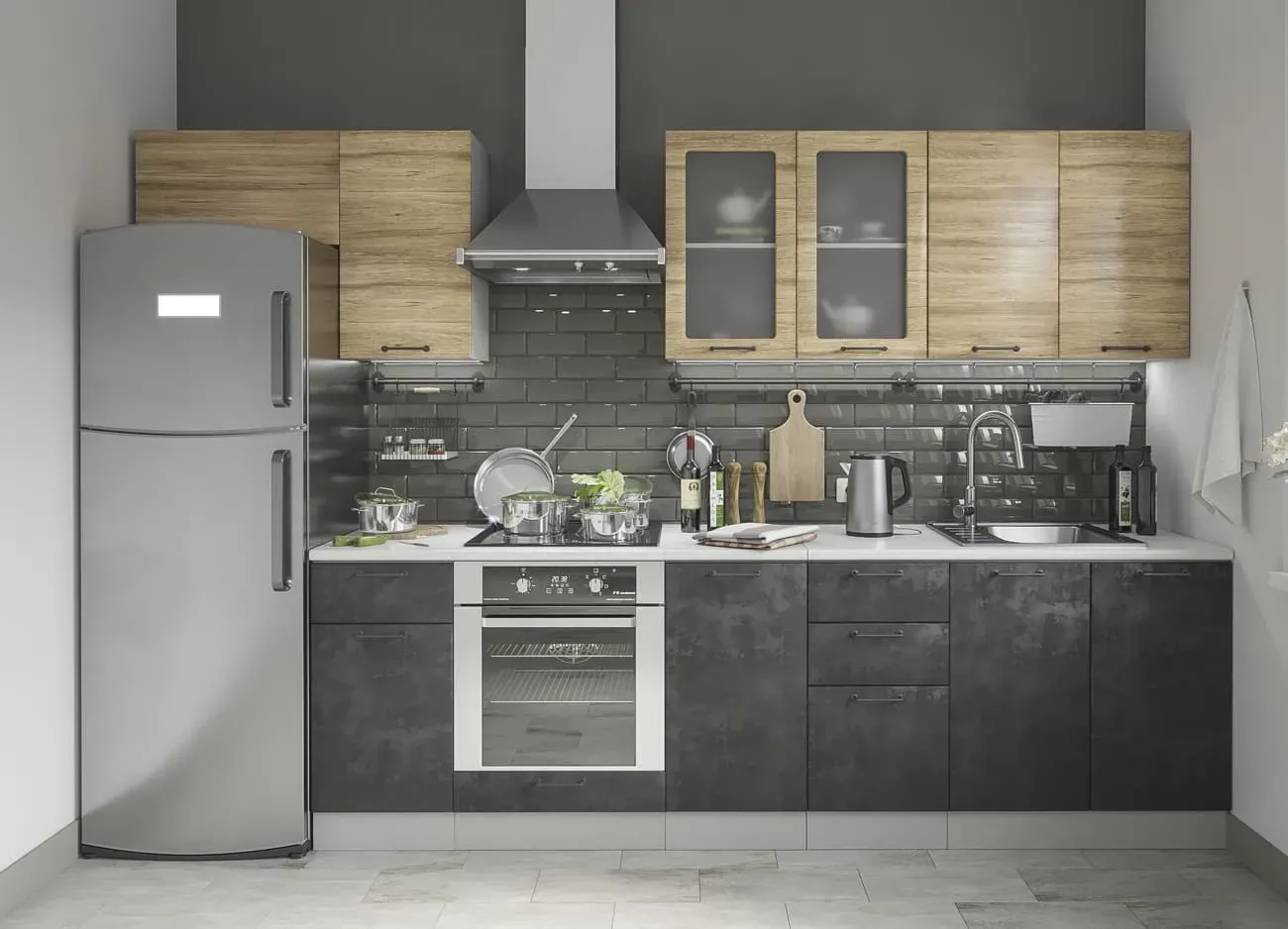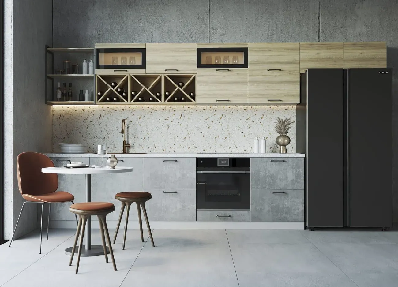 Дверцы из матового стекла можно поддержать светильниками в том же стиле, геометрической формы мебельные ручки помогают создать правильную атмосферу. Нотку мягкости придаёт включение в гарнитур деревянных фасадов. Все оттенки — бетона и дуба цикория соответствуют выбранной стилистике.