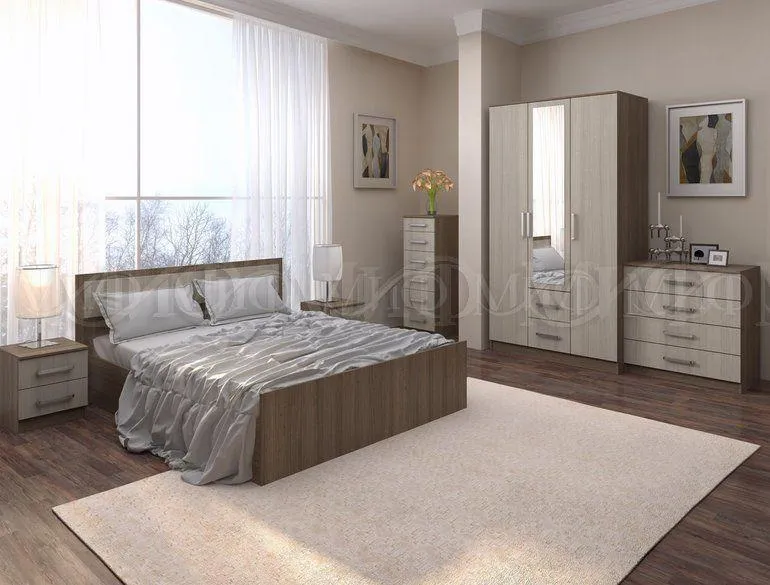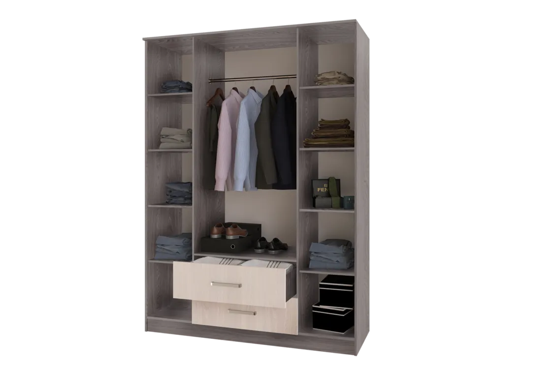 Четырехстворчатый шкаф "Фиеста" разделен на три секции. Средняя секция оснащена гардеробной штангой и двумя ящиками, в боковых секциях размещаются полки - по 4 полки в каждой из них.